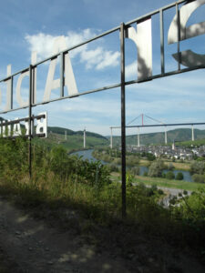 Brücke hinter Werbung für die Klosterbrauerei Machern, die gleich hier unten im Tal liegt.