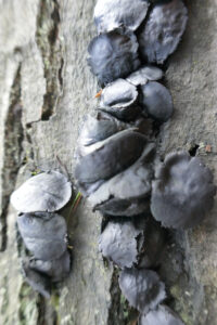 Seltsame Baumpilze, lakritzschwarz. In Unmengen auf gefällten Stämmen.
