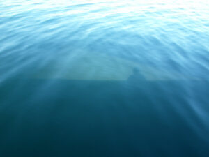 Wenn man sich in der Ostsee spiegeln kann, muß Flaute sein. Dabei bekommt man das Schönste sowieso nie zu sehen: das Schiff unter Segeln; dafür, merkt der Käptn an, bräuchte man einen 40 Meter langen Selfie-Stick.