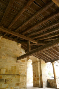 Vordach einer Kirche am Wegesrand; hier könnte sich eine ganze Pilgergruppe unterstellen.