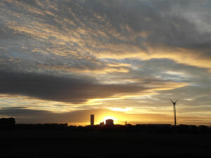 (Nach der Arbeit der Septembersonnenuntergang ist so schön, wie ich mich an lange keinen erinnern kann, ein ganzer Himmel betupft mit blau und goldenen Wolken, behängt mit schwarzen Wasservogelketten und an den Rändern von Windradflügeln gekitzelt, daß er rot wird.)